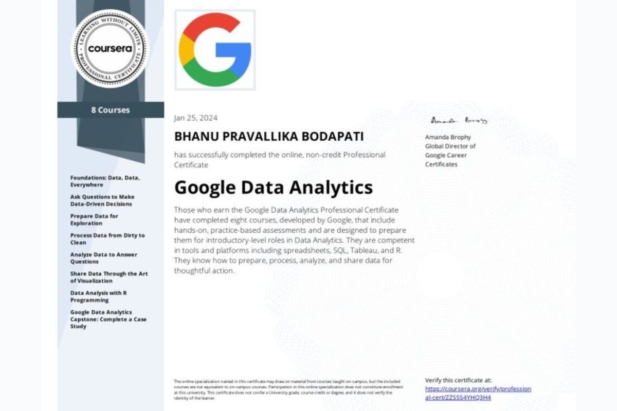 Google Data Analytics Professional Certificate là một trong những chứng chỉ Data Analyst Google phổ biến nhất dành cho người mới bắt đầu. Chương trình được xây dựng bởi đội ngũ chuyên gia dữ liệu của Google và được triển khai trên nền tảng Coursera.