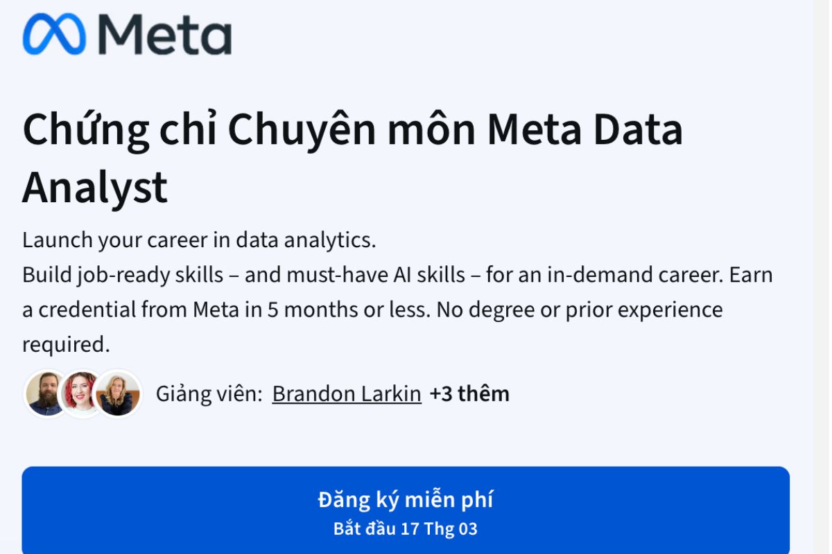 Meta cung cấp chương trình đào tạo Data Analyst thông qua Coursera, phù hợp với người mới hoặc những ai muốn chuyển sang lĩnh vực phân tích dữ liệu.