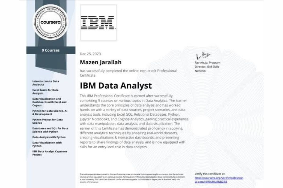 Sau khi hoàn thành, người học sẽ nhận được chứng chỉ chuyên môn từ IBM, có thể chia sẻ trên LinkedIn, CV hoặc hồ sơ nghề nghiệp để tăng độ uy tín khi ứng tuyển vào các vị trí liên quan đến phân tích dữ liệu.